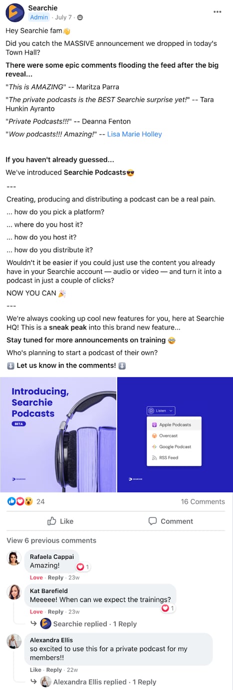 We loved this post from Sylvia. Each and every month we share Searchie Hacks, but we’re never really sure how they’ll be received by our community. But, when Sylvia tried out the May Searchie Hack of creating a Podcast funnel, it was evident our community was watching, listening and most importantly, taking action.